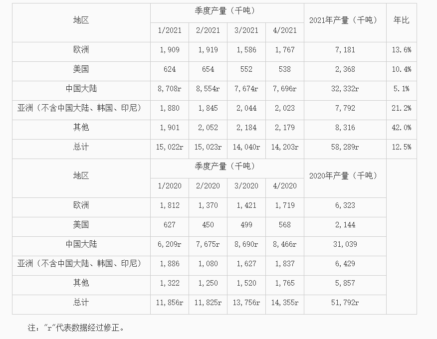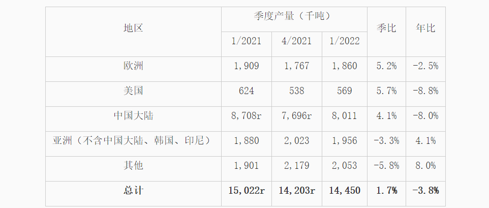 世界不锈钢协会6月20日发布的数据显示,2022年第一季,全球不锈钢粗钢产量达1445万吨,同比下降约3.8%而环比增长约1.7%。分几大地区看,欧洲同比下降约2.5%而环比增长约5.2%至186万吨,美国同比下降约8.8%而环比增长约5.7%至56.9万吨,中国大陆同比下降约8.0%而环比增长约4.1%至801.1万吨,不含中国大陆、韩国、印尼在内的亚洲(主要是印度、日本和中国台湾)同比增长约4.1%而环比下降约3.3%至195.6万吨,其他地区(包括印尼、韩国、南非、巴西、俄罗斯)同比增长约8.0%而环比下降约5.8%至205.3万吨。