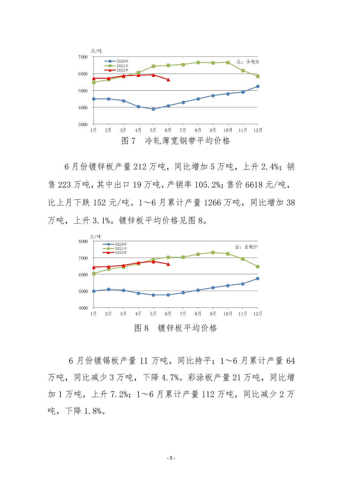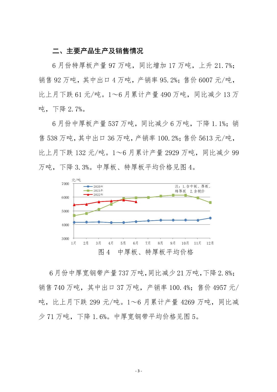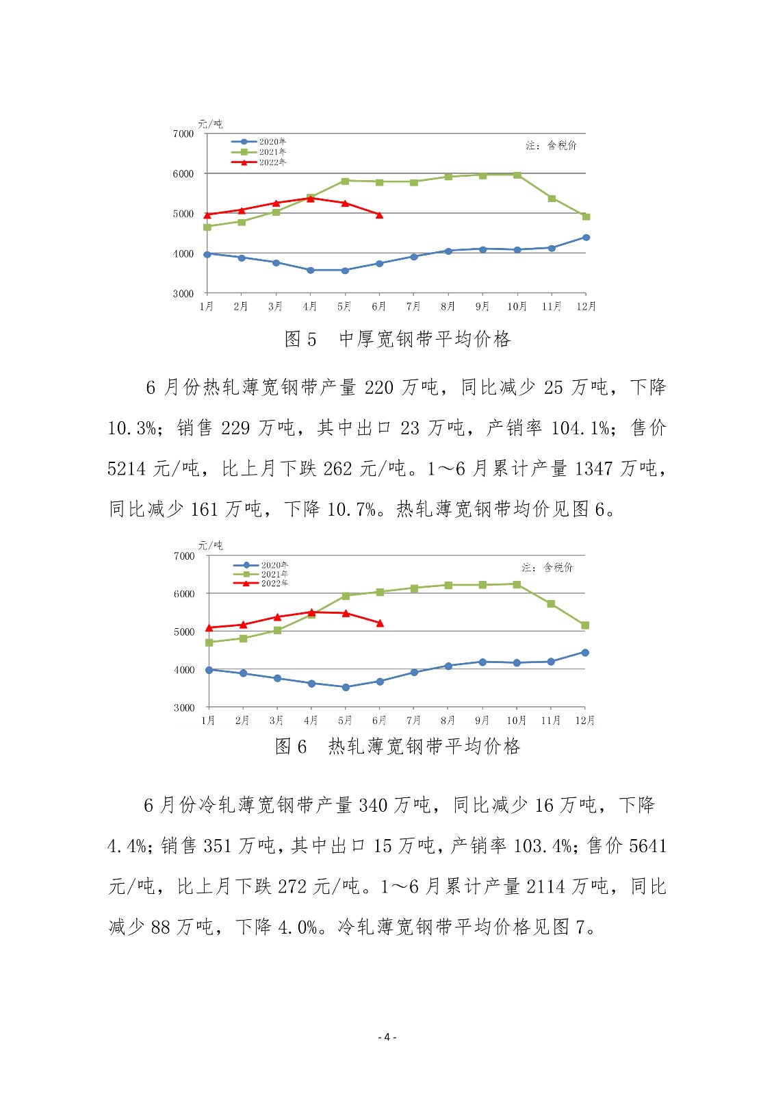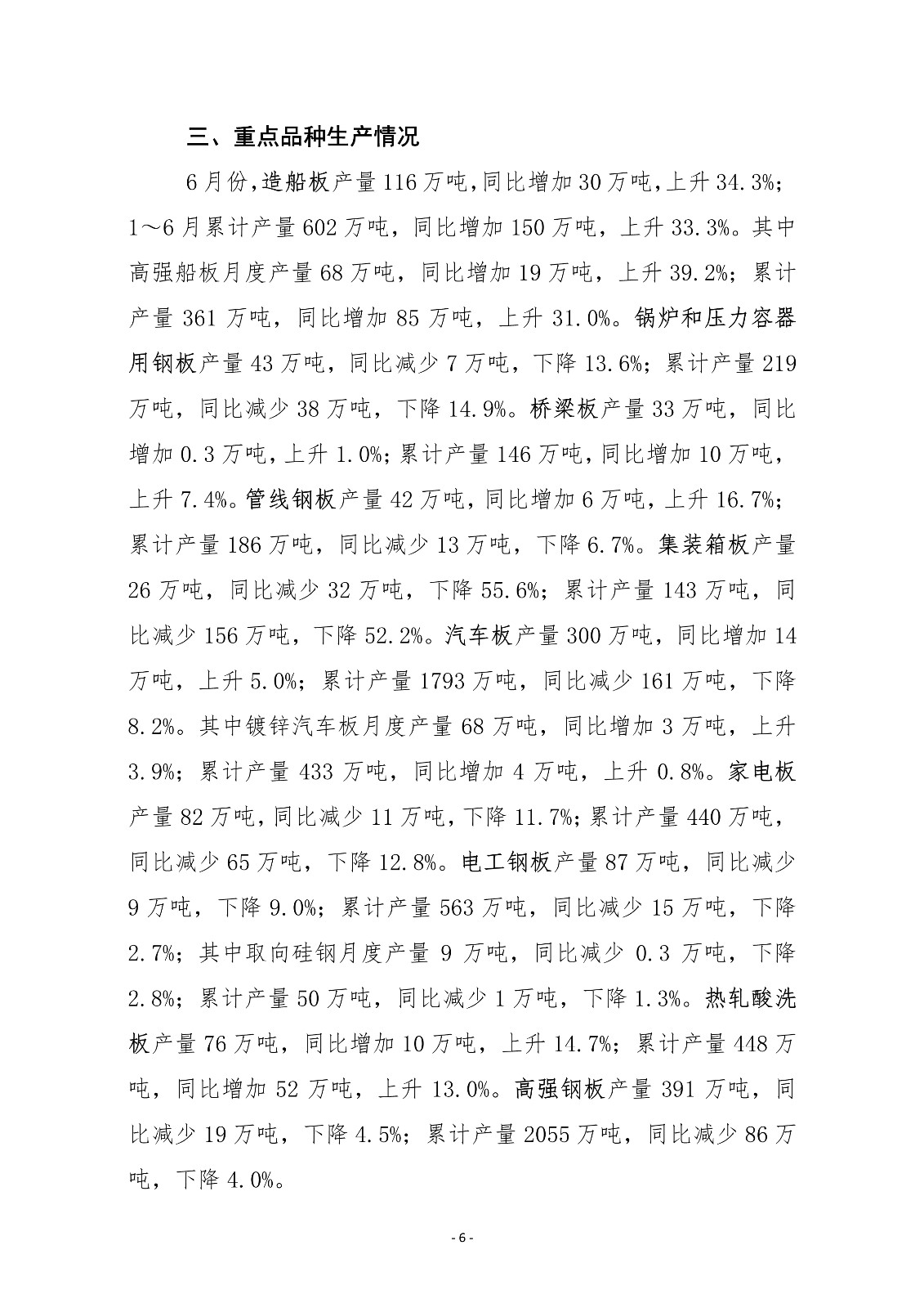 6月份,中厚板轧机产量环比、同比均有所上升;热连和冷连轧机产量环比、同比均下降。主要品种板中造船板、管线钢板产量同比实现较快增长;集装箱板、锅炉容器板、家电板、电工钢板产量下降幅度较大。1~6月份,三类轧机累计产量同比均小幅下降。主要品种板中,除造船板和桥梁板累计产量实现同比增长外,其他品种板产量均有所下降。